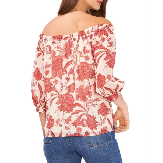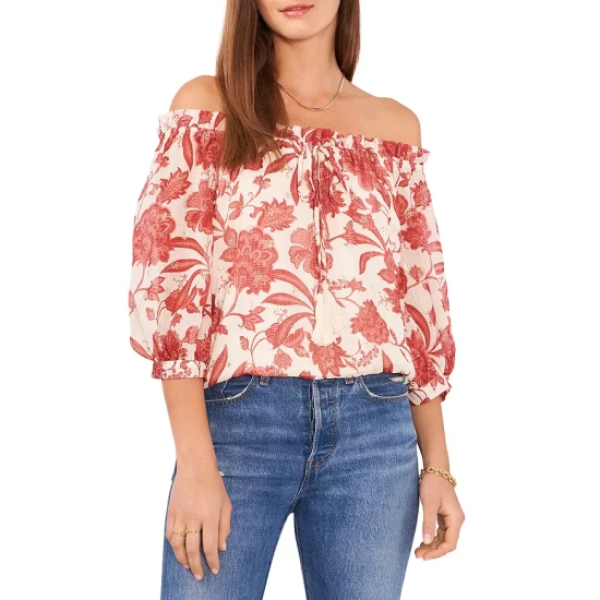 - Off-the-shoulder neck with tie closure