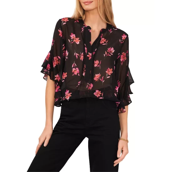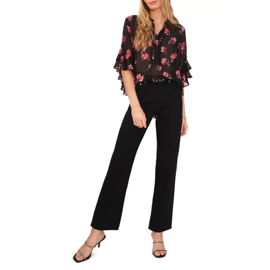 - Three-quarter length asymmetric sleeves, ruffled cuffs
