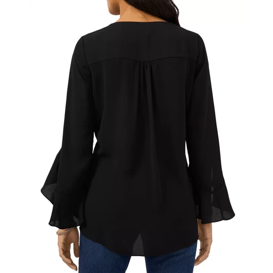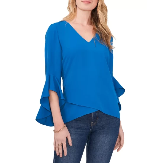 - Three-quarter-length flutter sleeves with ruffled high-low cuffs
