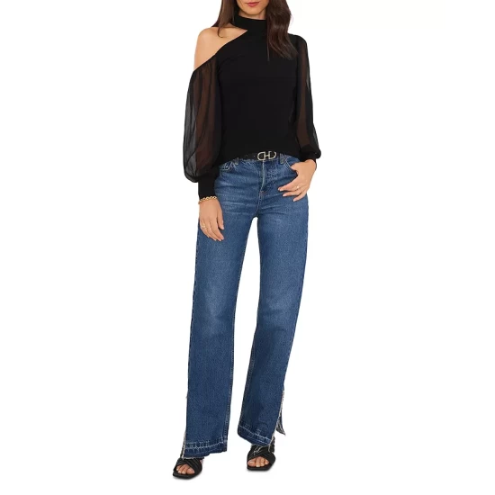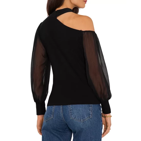 - Long semi-sheer blouson sleeves, fitted cuffs