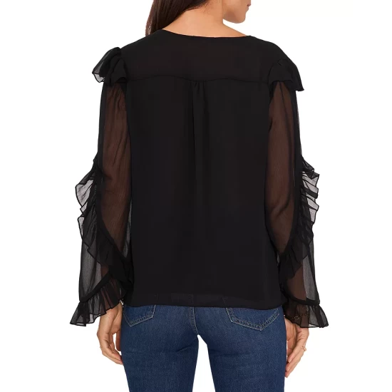 - Long sheer sleeves with ruffled cuffs