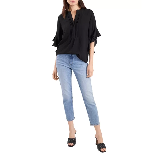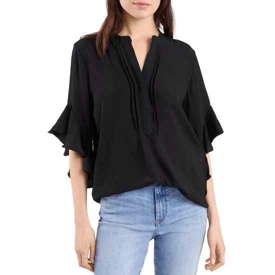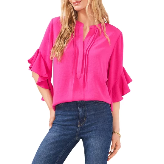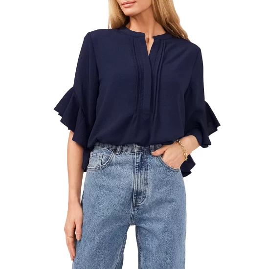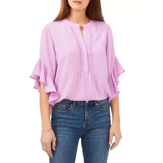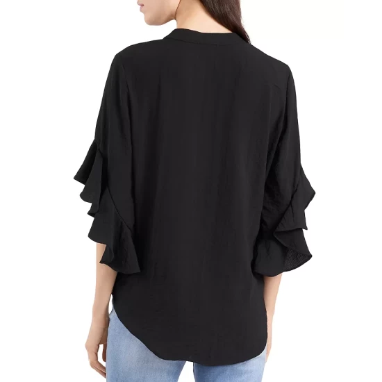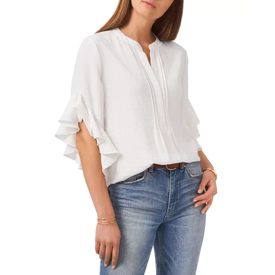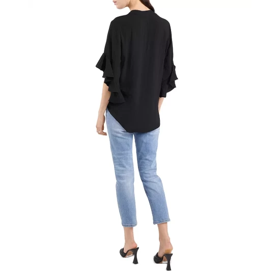 - Short dolman sleeves with ruffle cuffs